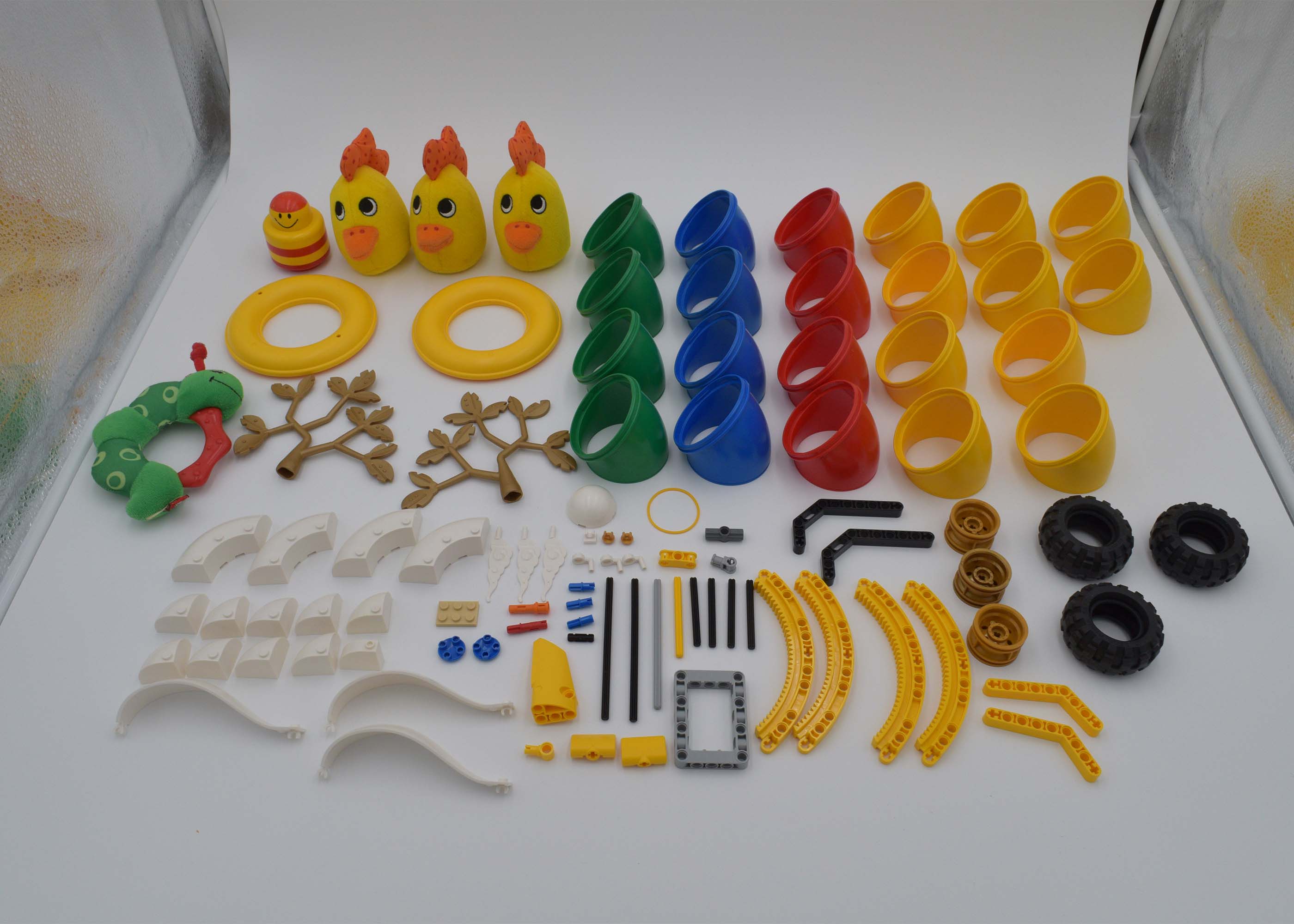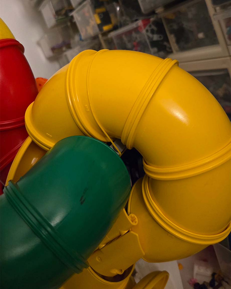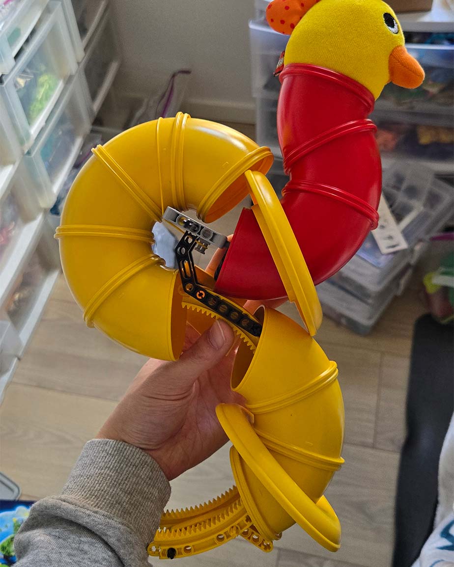 As with every Rogue Olympics round, I had a limit of 101 parts. The Duplo parts inherently contribute to the size; however, there was the matter of optimizing the internals to be parts efficient and stable. I used a variety of Technic liftarms to create a skeleton to hold up the tubes. In particular, the rotation gear liftarms work nicely to guide the tubes while providing strength.
