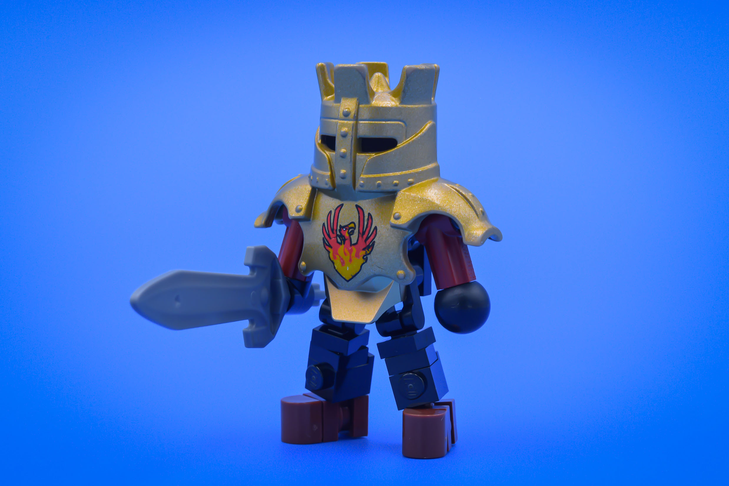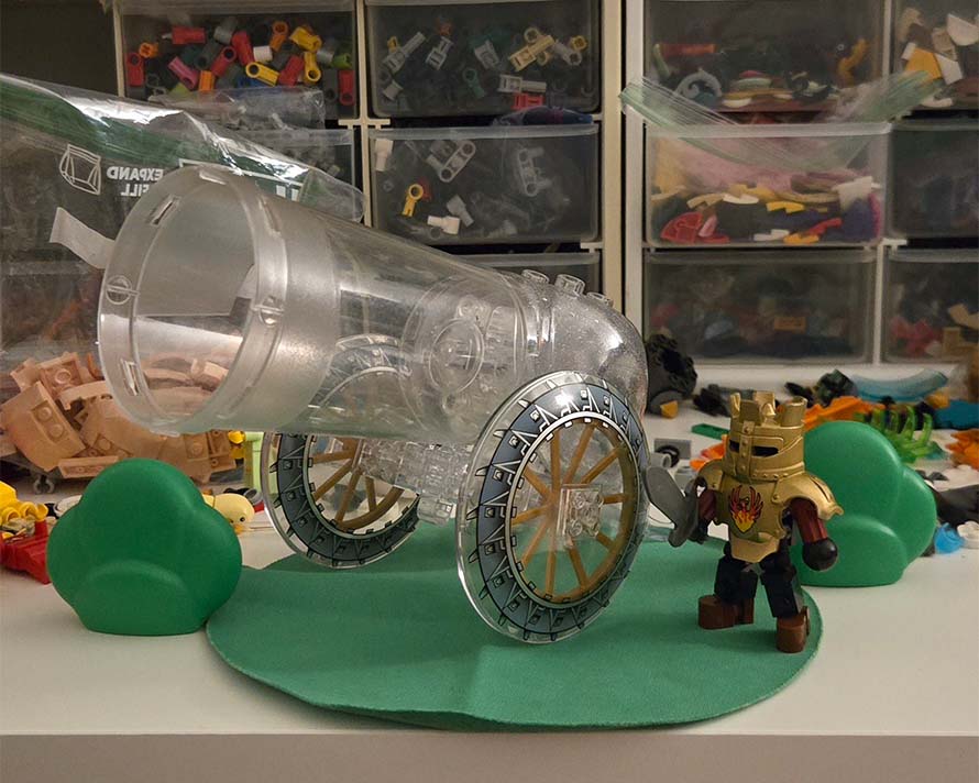 The cannon only ate up 36 pieces, so I still had plenty of parts to play around with. The subject matter of a literal glass cannon along with the cartoonish look - mostly due to the use of those big duplo elements - led me to wanting to make a character that further emphasized the cartoony/mobile game look. The knight (john darksoul) uses a duplo armor piece, but the rest of the body is entirely brick built rather than using a duplo figure. By building it out of system, I had more control in the shape language of the body, and emphasized the cartoon/mobile game style by rounding off the hands and feet. Furthermore, the limbs are geometrically simple (low poly), which I believe to also help. Lastly, the sword is from a Knight's Kingdom Nestlé toy.