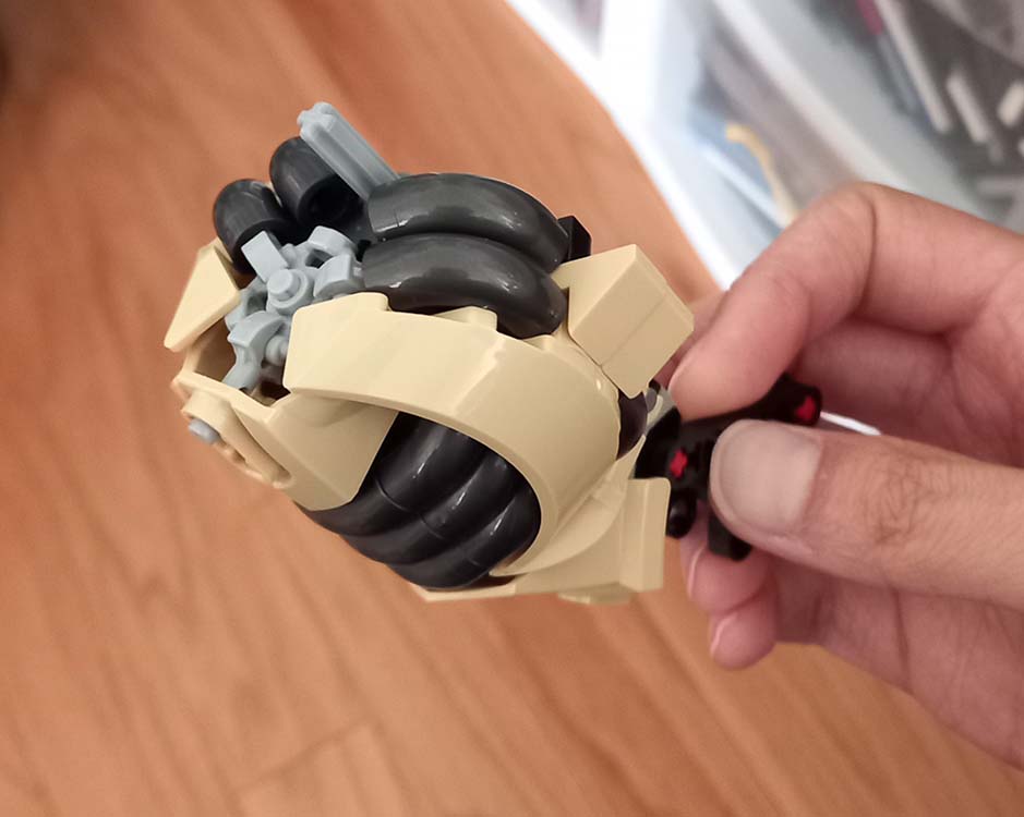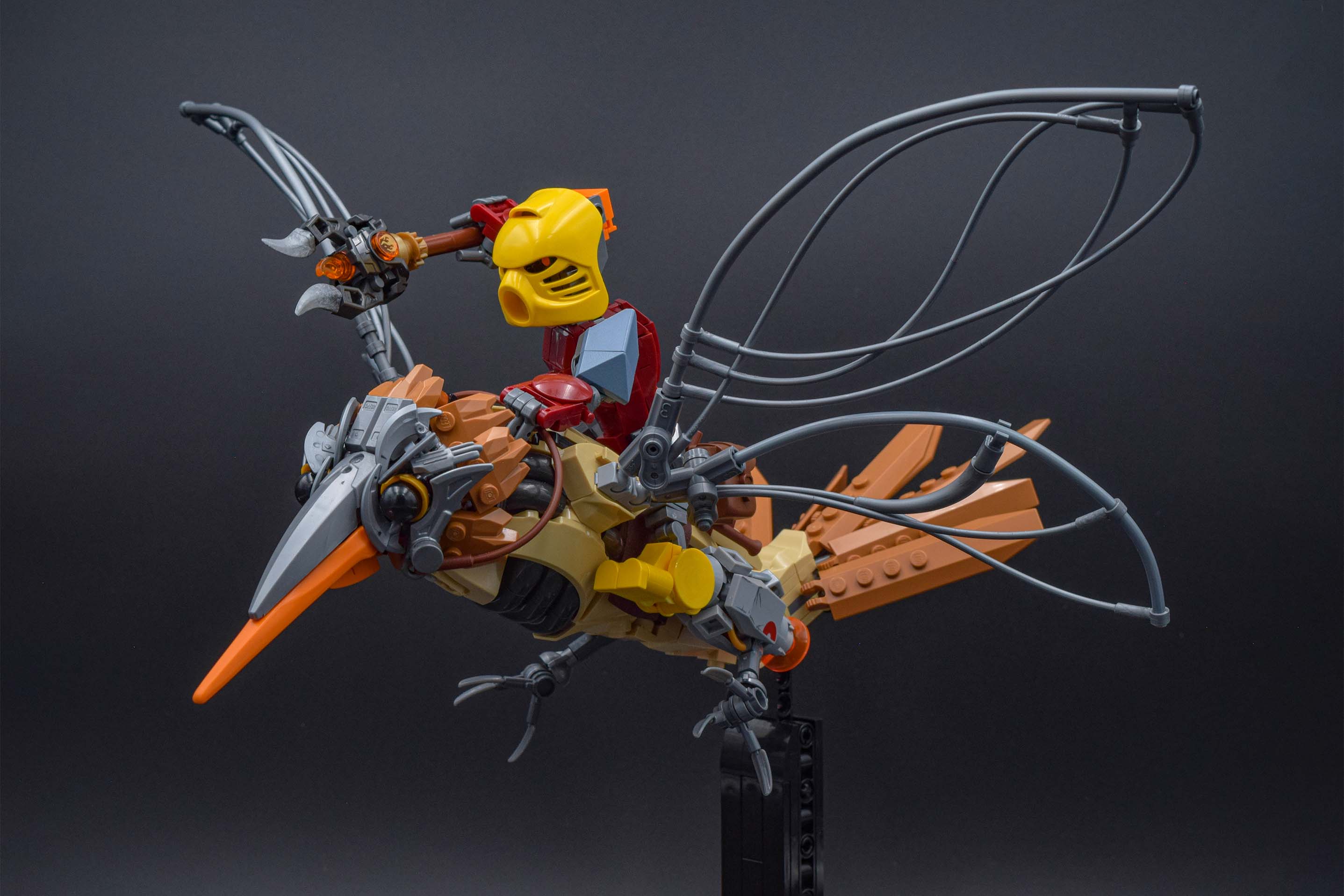 I remember struggling quite a bit at the start of this MOC. In general, bird builds are tiny, which limits the amount of space to work with. I struggled quite a bit trying to figure out a good blend and separation of textures of organic, mechanical, and armor details as well as condensing all of that into a tiny space. Furthermore, I had to scale Jaller such that he could ride on an already small animal.