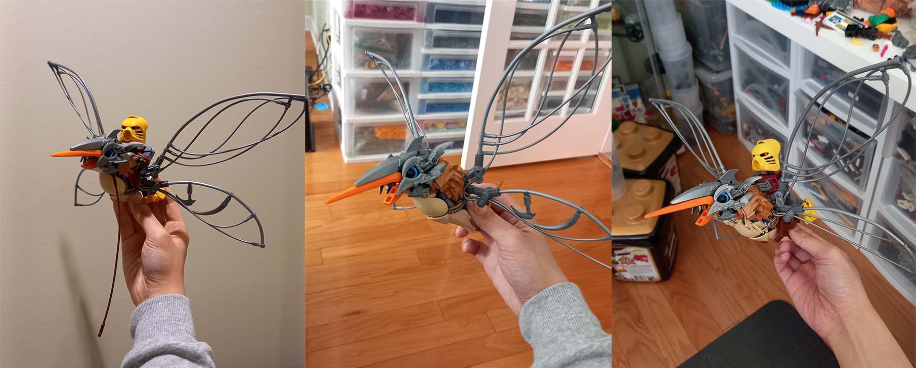 The zipline/flex tube wings were one of the first parts I built for the MOC. One of the concept designs pictured previously had insect wings, and I thought that would be a neat feature to include. I settled on dragonfly wings as the Gukko's appearance in MoL and in the set has two pairs of wings. In regards to creating the wings first, I felt it was important to see if this was even possible with LEGO; otherwise, I would have to change direction for the MOC.
